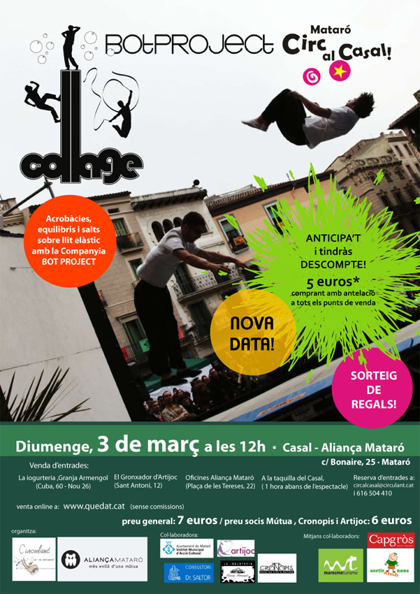 Aquest diumenge es presentarà a Mataró, circ al casal! l’espectacle COLLAGE de Cia. BOT PROJECT una combinació d’acrobàcies, equilibris i salts sobre llit elàstic prevista pel mes de febrer però que per malaltia d’un artista es va haver de suspendre a darrera hora.