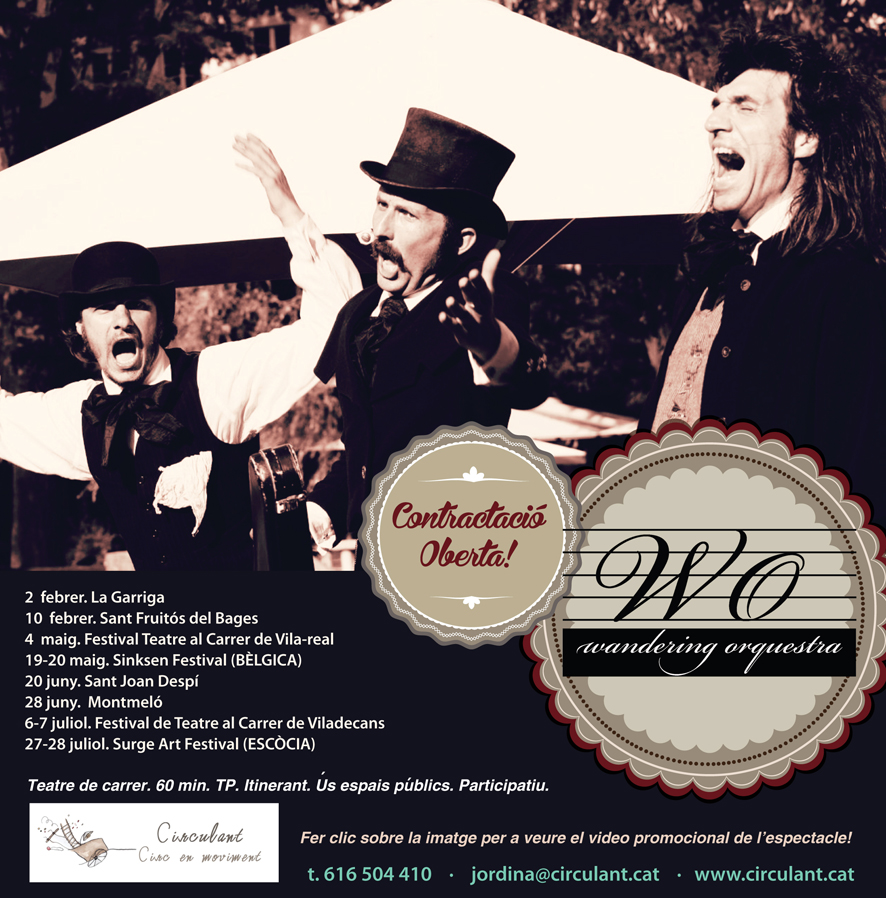 L’espectacle de teatre de carrer La Wandering Orquestra estrenat a Fira Tàrrega’12 estarà en gira aquest 2013. La banda de músics que arriba a la ciutat per fer un concert però que haurà d’improvisar l’espai, actuarà els propers mesos en diverses ciutats tan catalanes com de l’estat espanyol i internacionals. Pel que fa a la província de Barcelona, Wandering Orquestra ha estat seleccionat en el Circuit de la Xarxa d’Espais Escènics Municipals de la Diputació de Barcelona sent present en les programacions de La Garriga, Sant Fruitós del Bages, Teià, Sant Joan Despí i Montmeló.