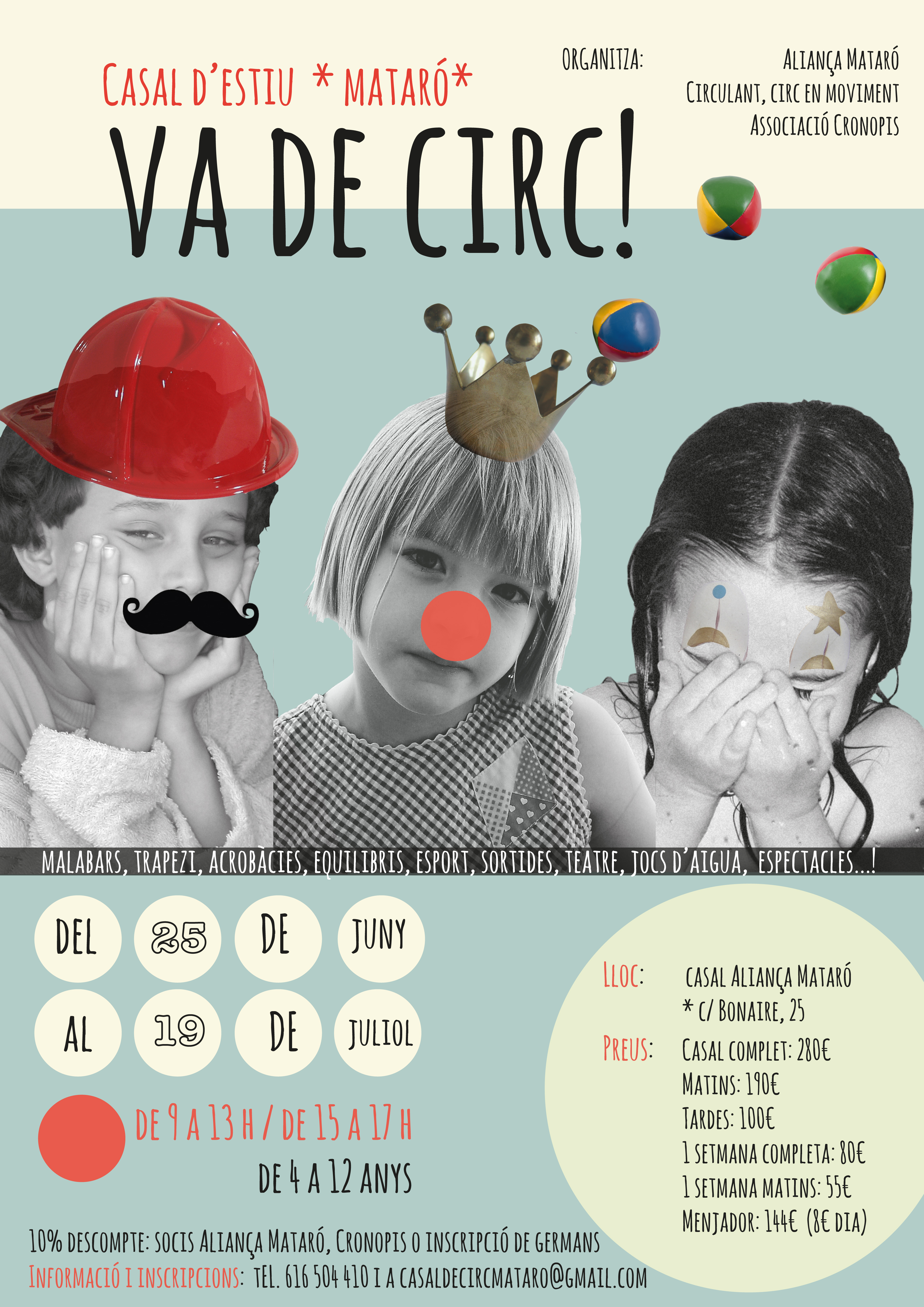 Adreçat a infants de 4 a 12 anys (3 anys també si enguany en fan 4), tindrà lloc a Mataró entre el 25 de juny al 19 de juliol en horari de 9 a 13h i de 15 a 17h, i amb el servei de menjador si es vol. Oferim flexibilitat en horaris i calendari. Us recomanem fer-lo complet amb un preu de 280€, però és possible en modalitat de casal matins (190€), casal tardes (100€), per 1 setmana completa (80€) o 1 setmana matins (55€). Hi ha descomptes en cas de socis d’Aliança Mataró, de Cronopis i en cas d’inscripcions de germans. Les inscripcions són obertes fins el 31 de maig trucant al 616 504 410 i escrivint a casaldecircmataro@gmail.com i us informarem i formalitzarem la matrícula.