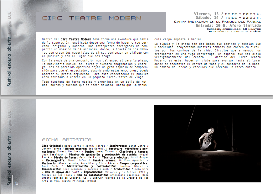 Aquest divendres 13 de gener Circ Teatre Modern obrirà la XIIIa edició del Festival Escena Abierta dedicat a les noves tendències en arts escèniques a la ciutat de Burgos. La direcció del festival atenta a les noves creacions ha apostat per programar el Circ Teatre Modern estrenant la creació fora del territori català. La petita carpa de viatge amb aforament per 120 persones s’ha instal.lat al Parc del Parral, al costat de la zona universitat de Burgos, on habitualment s’instal.len els petits circ itinerants.